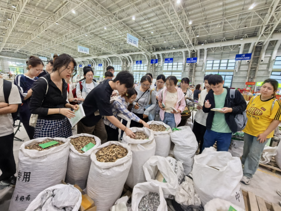 作为此次实训的压轴环节,实训队伍走进了安国数字中药都。在热闹的药材交易大厅,学生们以小组为单位,带着“药材真伪优劣鉴定”的明确任务,将课上所学的鉴定技术付诸实践。他们围绕数十种易掺假药材及珍稀贵重品种展开现场鉴别,通过观察外观、触摸质地、闻辨气味等方式,细致区分药材真伪、判断品质优劣,同时深入理解不同药材的商品规格与等级划分标准。此外,学生们还主动与药商面对面交流,从市场供需到流通环节,全方位了解中药饮片的市场动态。这一过程不仅让大家熟练掌握了实战鉴别技能,更清晰认知了市场价格形成机制,真正实现了理论知识与实践应用的融会贯通